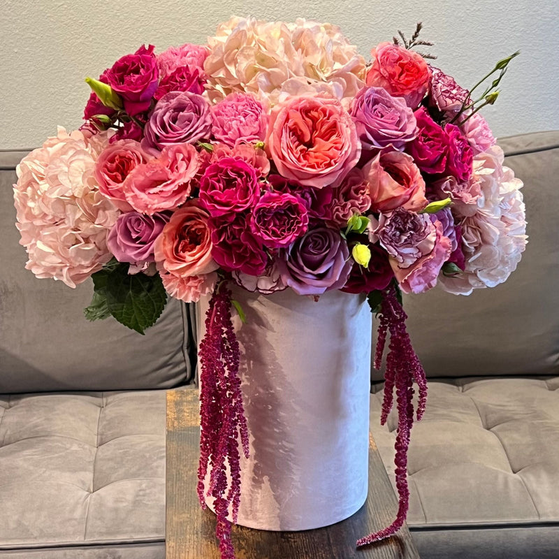 Hydrangea, Garden Roses, Roses and Carnations mixed in a hat box
