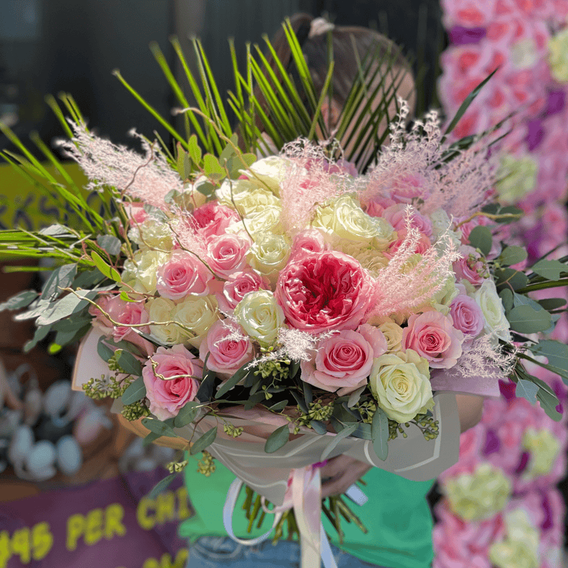 50 White, Pink and Garden Roses with feathers, branches and palm leaves. Could be customize any color by request