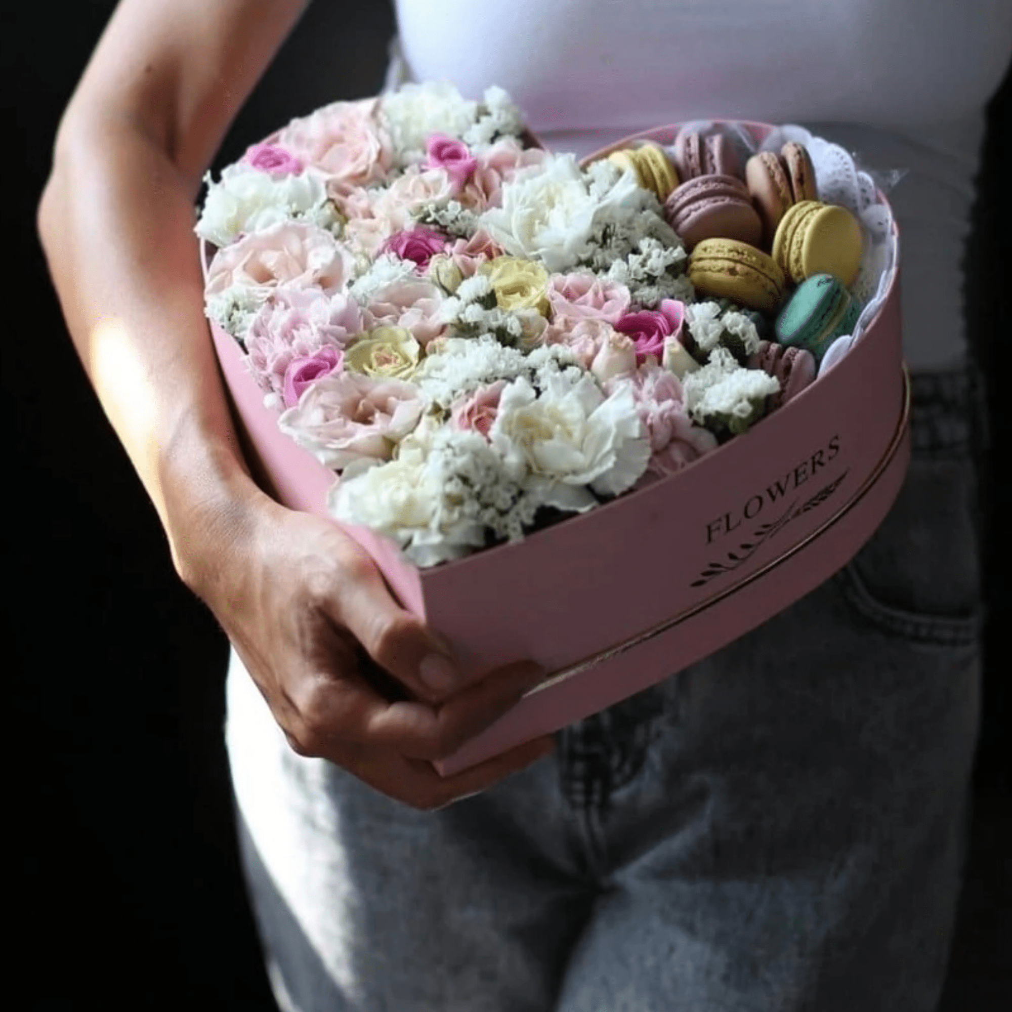 Mixed Flowers with assorted macarons in the delightful charm of La Provence Bakery's handcrafted macarons. Each box comes with 8 vibrant, homemade French macarons, beautifully nestled in a chic heart-shaped box. These exquisite treats are not only a visual feast but also a taste sensation, featuring a variety of flavors that will satisfy any sweet tooth.