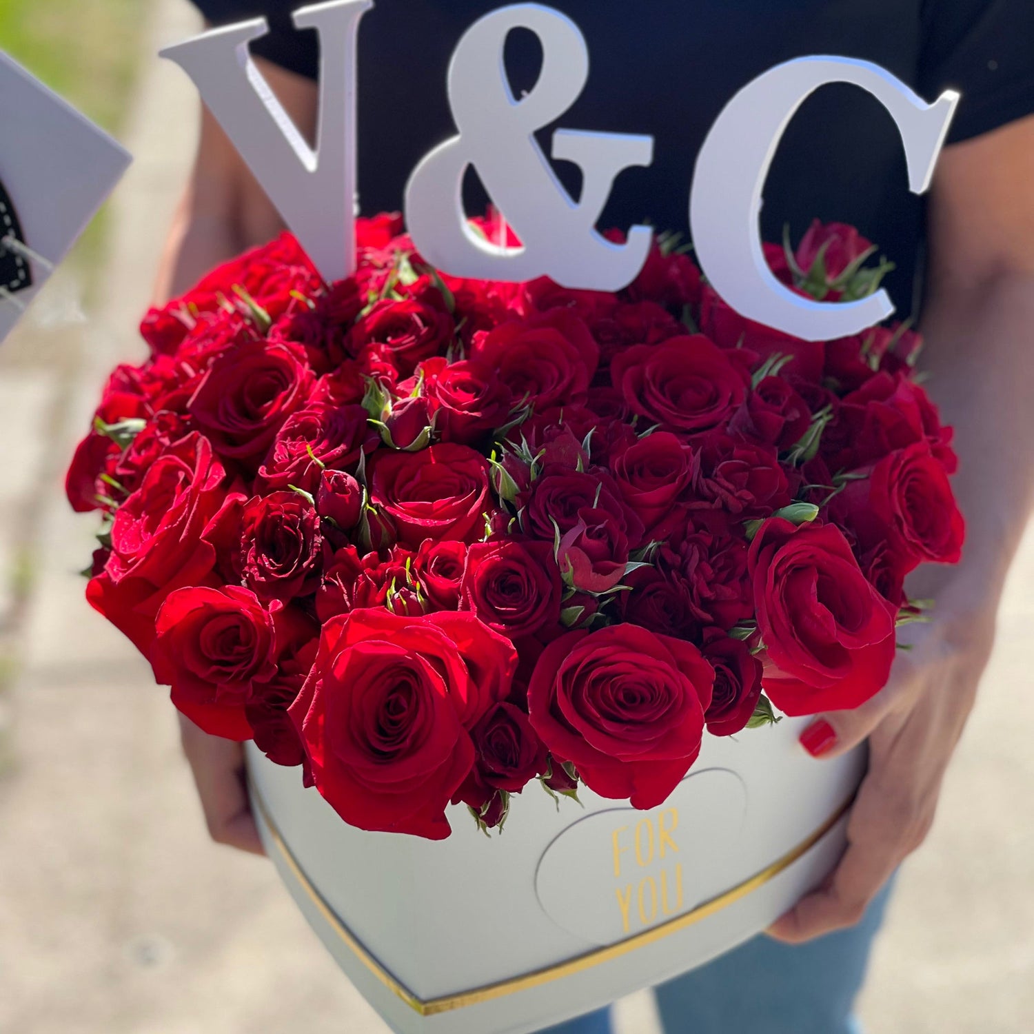 Red Roses in a heart box with monogram (2 letters and a sign & included in a price). Write your letters in comments during check out. Size L