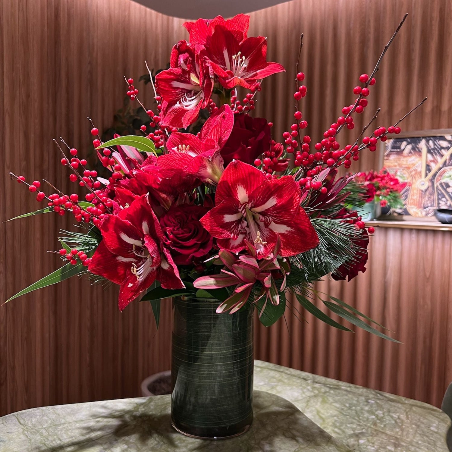 Amaryllis, Roses and Christmas Branches in a tall vase (included)