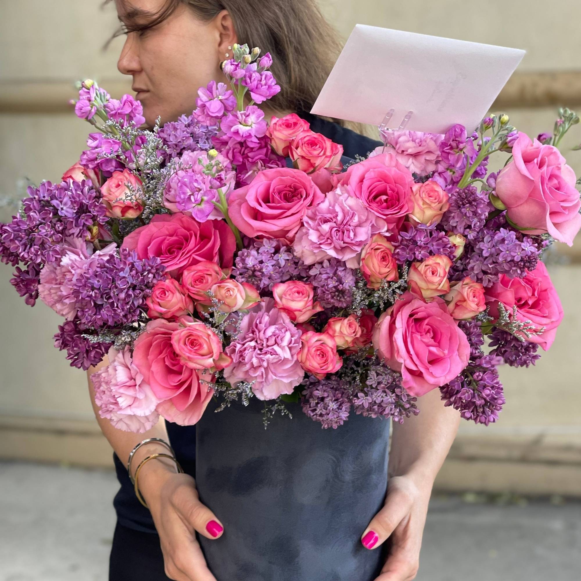 Lilac, Roses, Matthiola, Carnations and Spray Roses. Size Medium