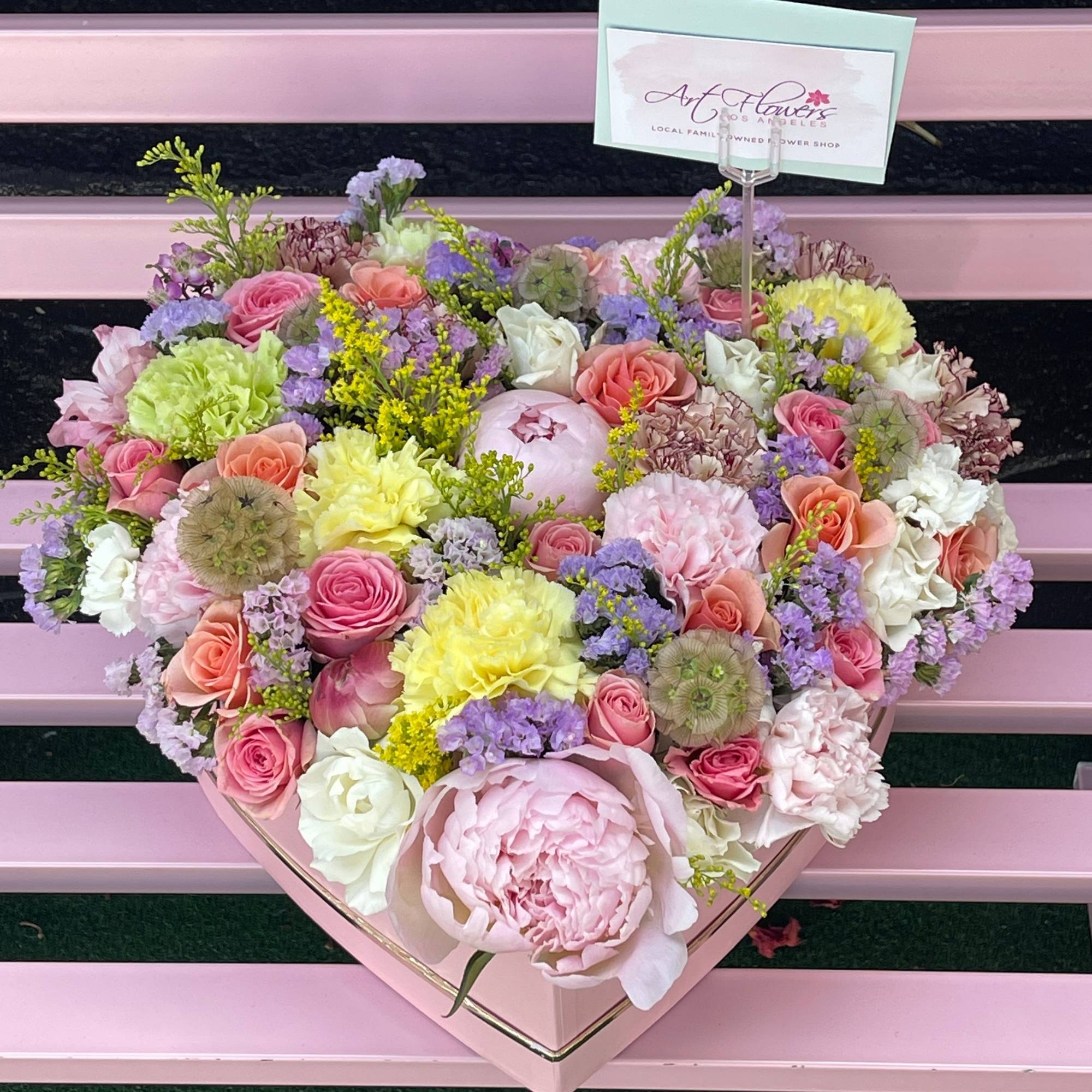 Mixed flowers and peonies in a heart box. Size Medium (on the picture)