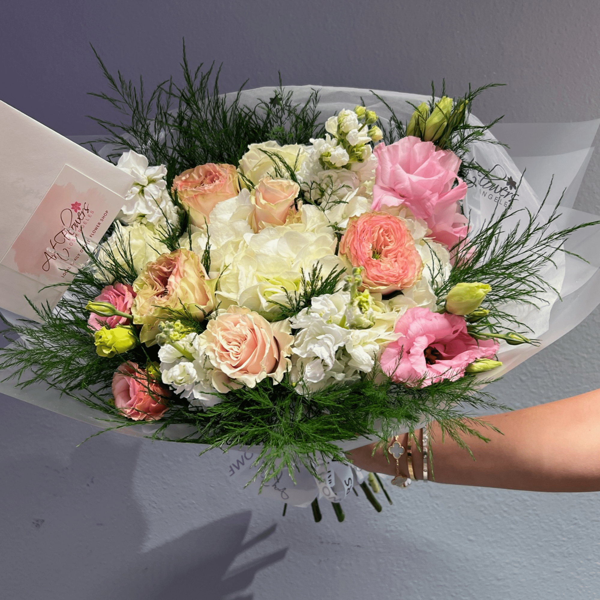 Hydrangea, Roses, Lisianthus, Matthiola and Greens
