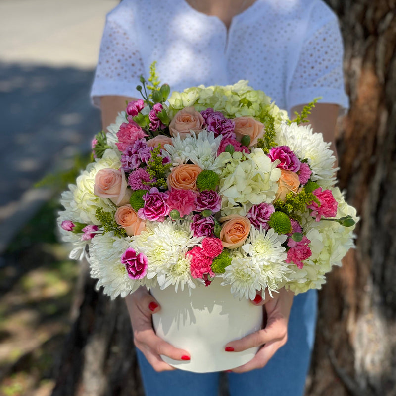Chrysanthemums, Roses, Hydrangeas, Carnations and Greens are all in a box.