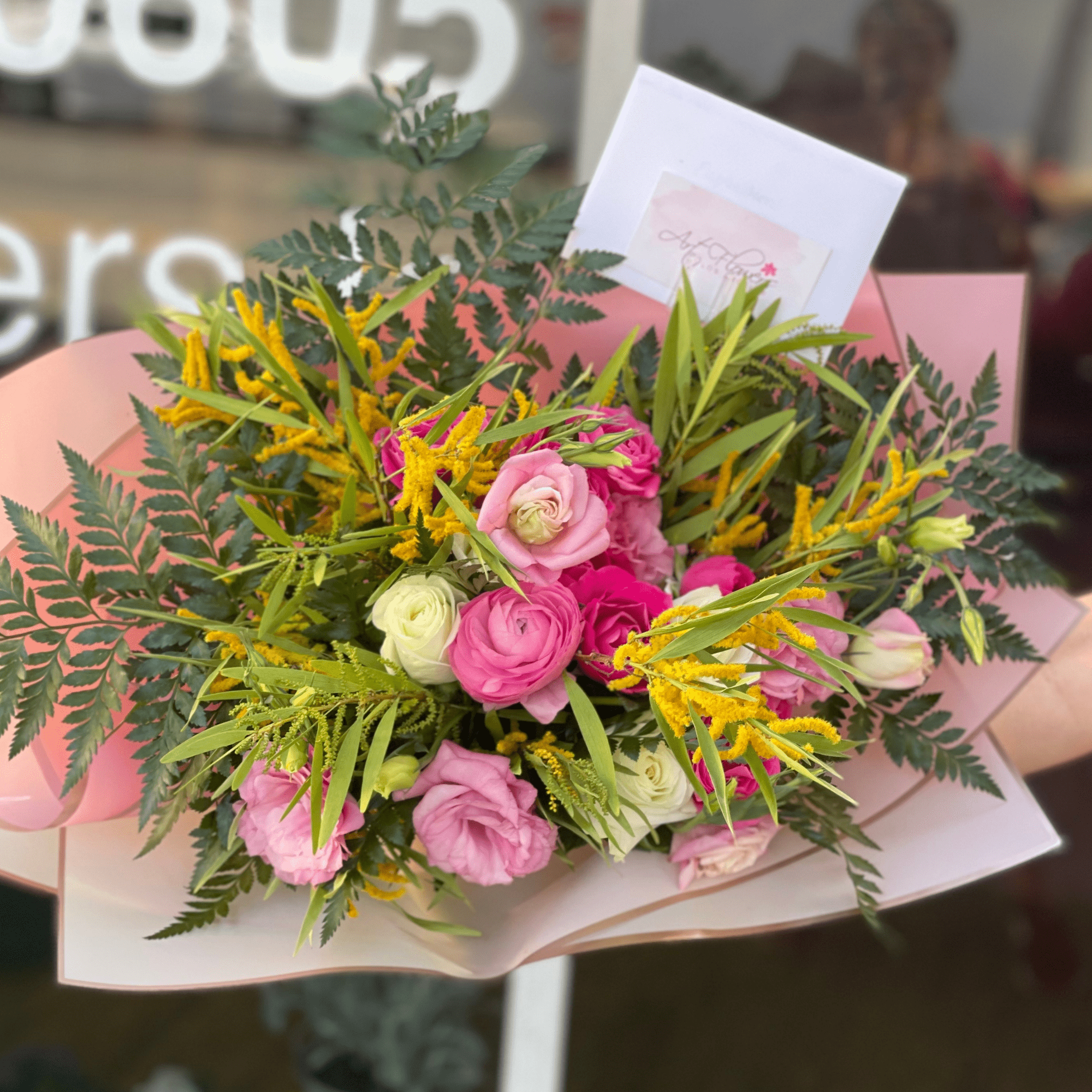 Roses, Lisianthuses, Mimosas and Eucalyptus.